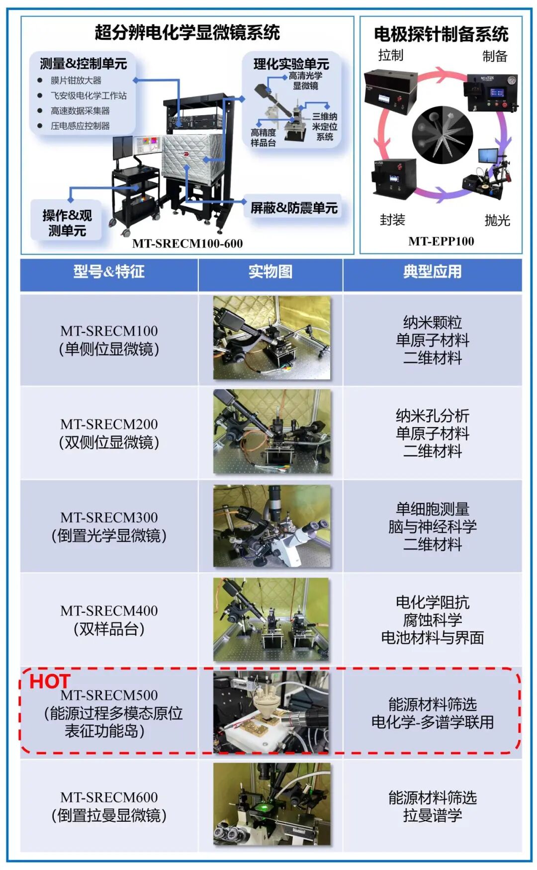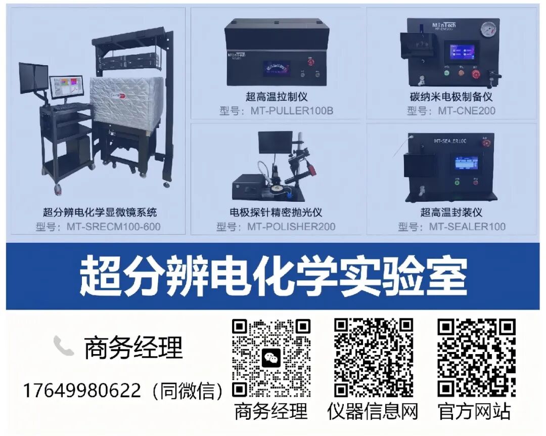 中国科学院长春应用化学研究所周敏研究员团队自主研制的超分辨电化学显微镜系统(MT-SRECM100-600,六大主力型号),通过飞安级电化学工作站(MT-FAEC100)、微秒级膜片钳放大器(MT-PATCH100)、纳米压电模块及电极探针制备系统(MT-EPP100)等核心组件的协同创新,重构了电化学显微技术体系。