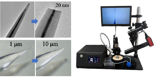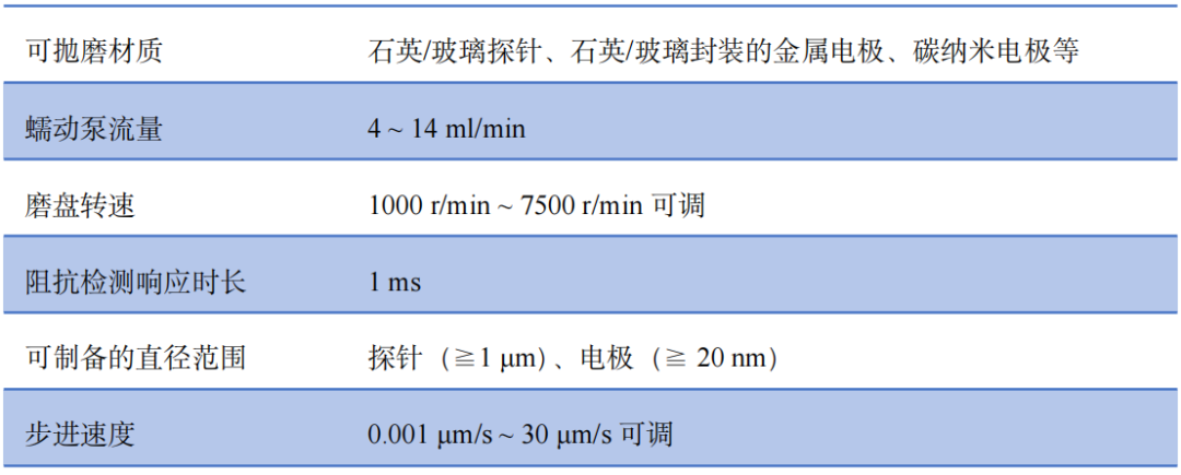 用于对拉制后的玻璃探针以及金属微电极进行进一步加工,如锻针、抛光、弯曲、拉尖、缩小金属微电极的RG比等。